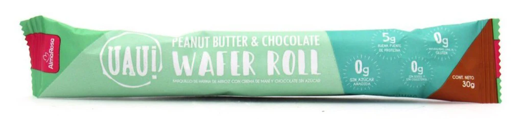 *. El Barquillo Wafer Roll Uau es un barquillo sin gluten, elaborado con panela orgánica y relleno de una cremosa mezcla de mantequilla de maní y chocolate.
