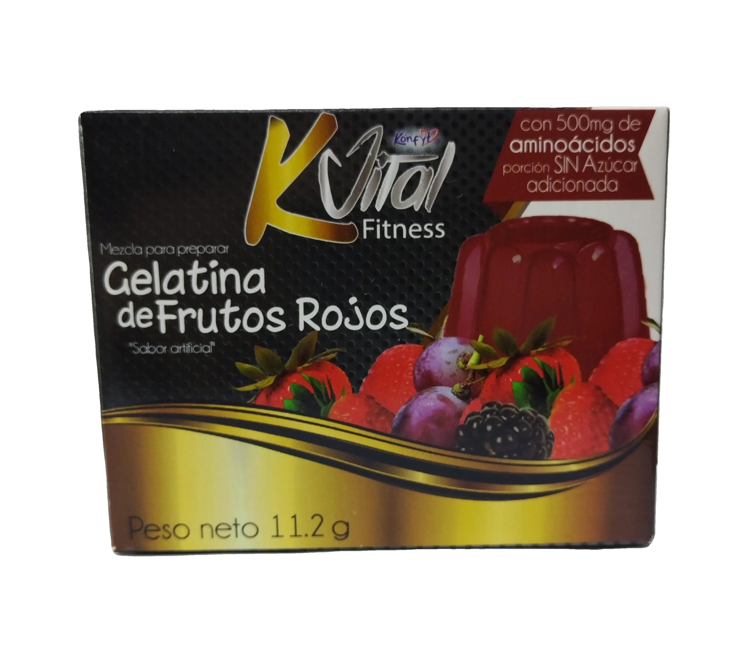 *. Gelatina baja en calorías con sabor a frutos rojos, enriquecida con colágeno.