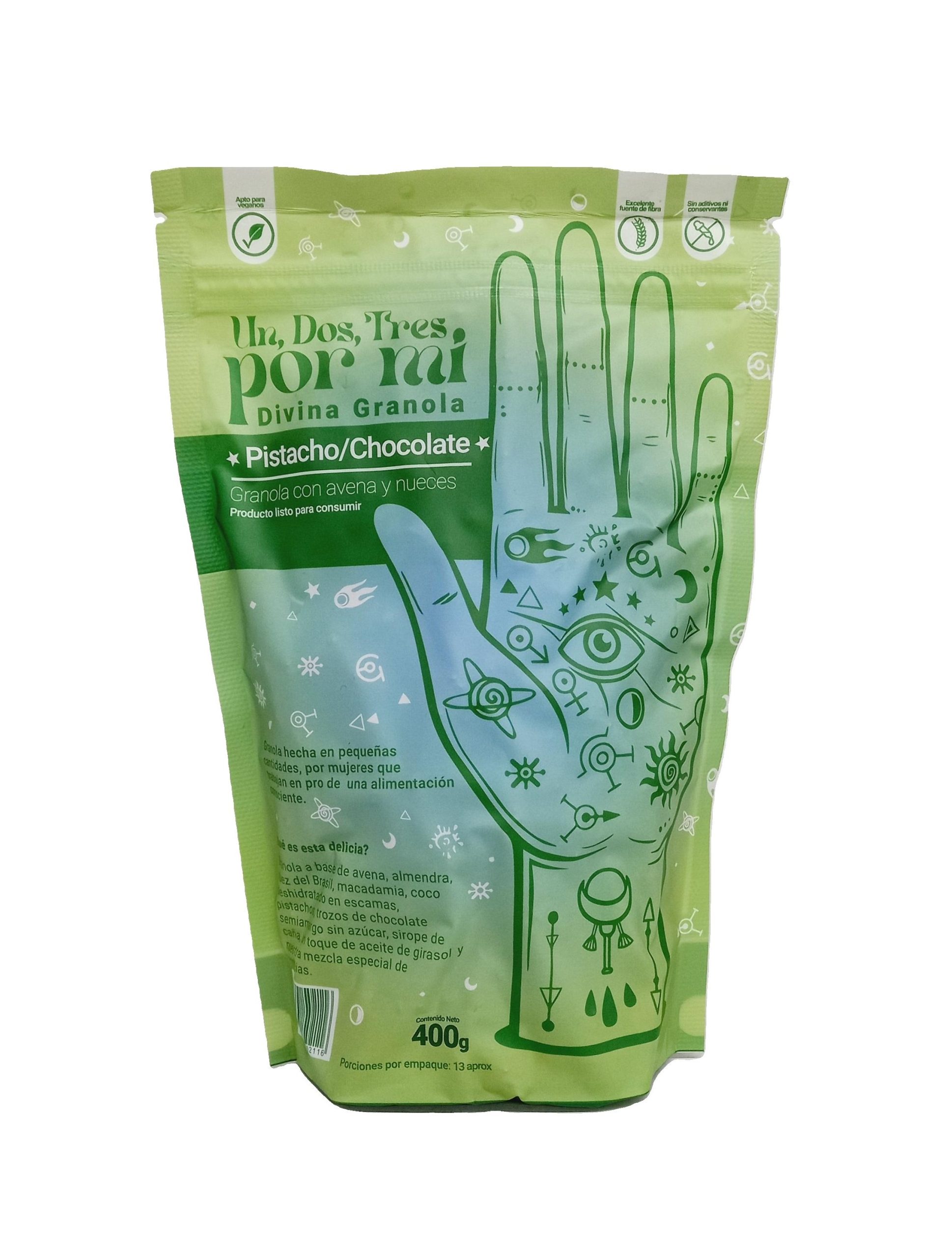 *. Granola con avena, nueces, pistacho y sabor a chocolate.