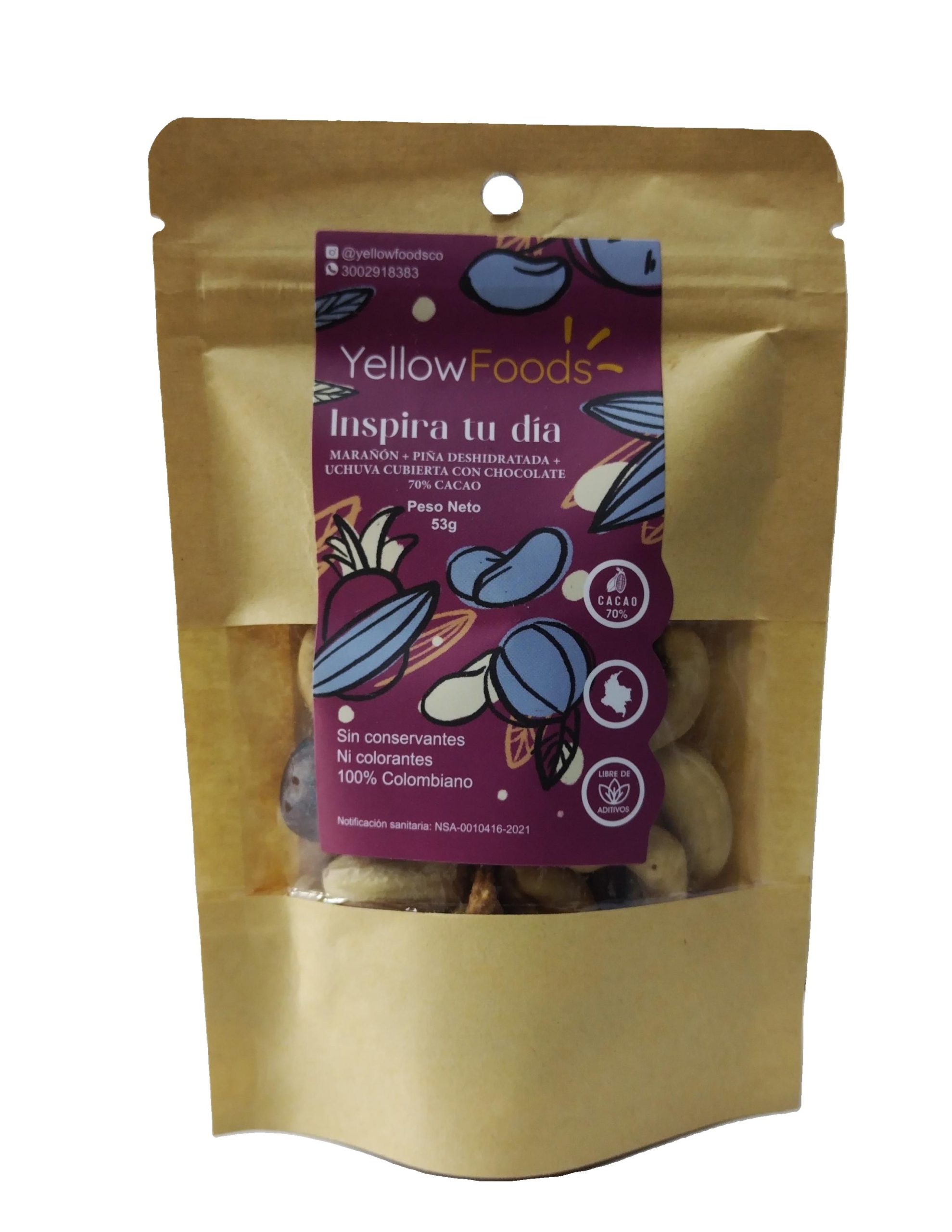 *. Marañón, piña deshidratada, uchuva cubierta con chocolate, endulzante.